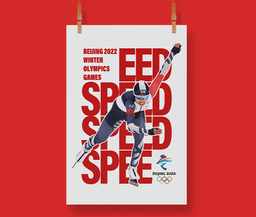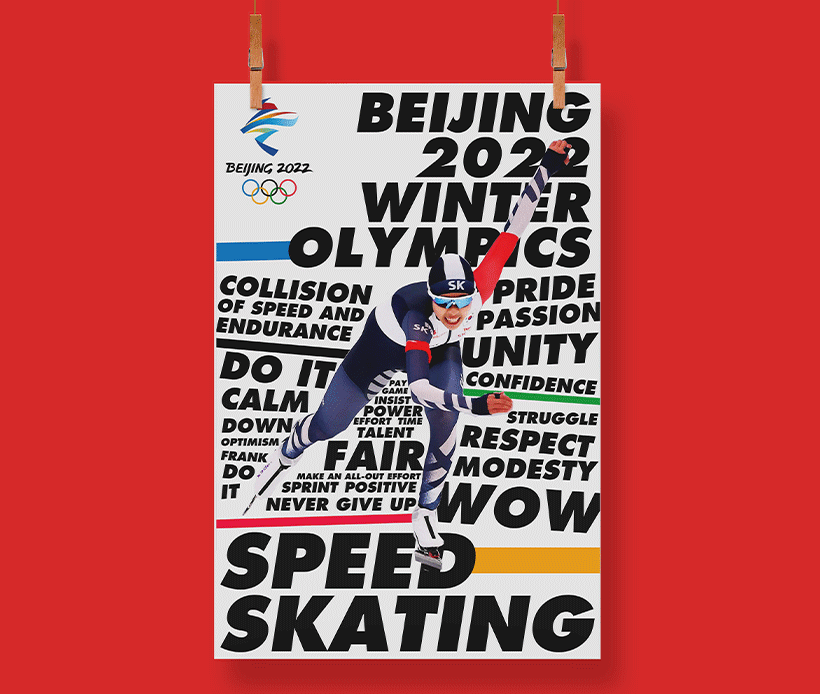 For these 2 posters, I wanted to use photos combined with text to show the movement of speed skating. For the first poster, I used various "keywords" as the background and used these words to shape the layering of the poster. You can feel the words pushing the speed skater forward.