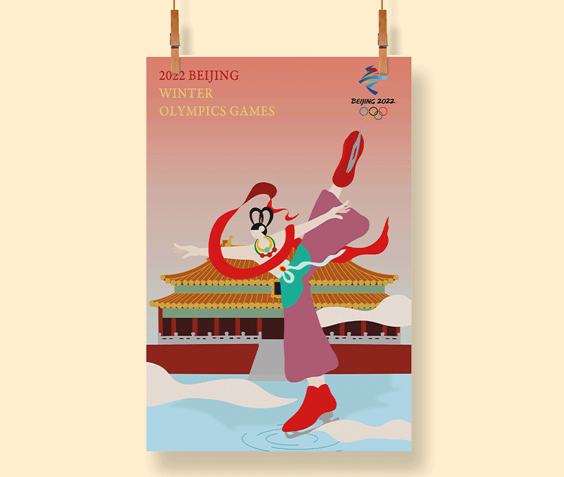 This poster is about figure skating. The costumes and images of the characters are based on the fairy "Flying Sky" in the Dunhuang frescoes, and the background is the tower of the Forbidden City because the Winter Olympics will be held in Beijing, China. The lightness of the figure skaters is expressed with the streamers on the clothes.