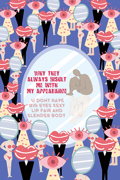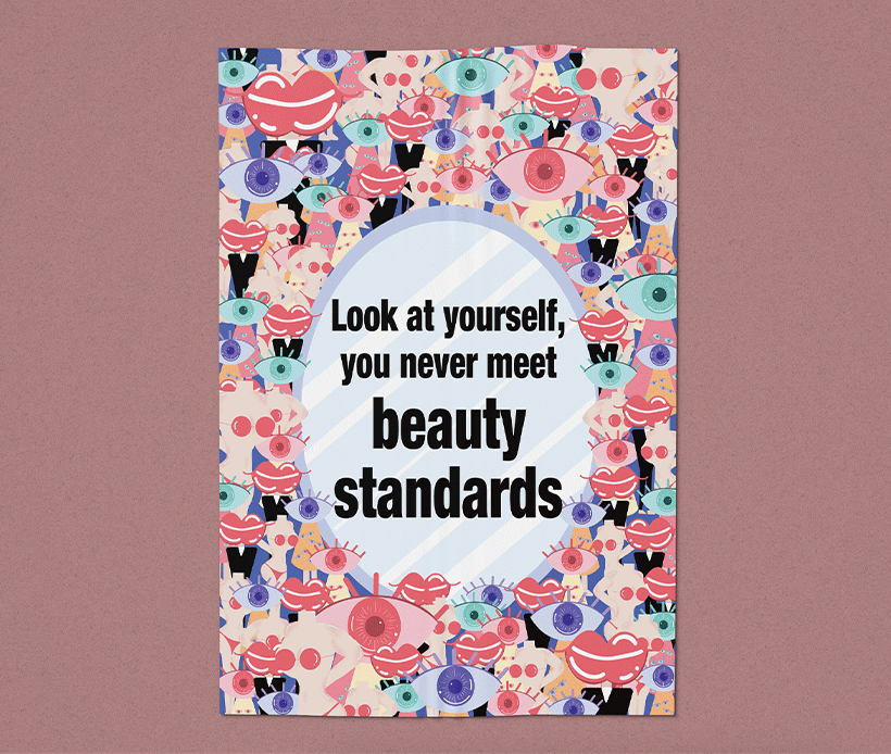 The purpose of this poster is to criticize the current social phenomenon that has an aesthetic standard for appearance. People have a harsh and fixed aesthetic for their appearance, and will verbally attack those who do not meet the "standard aesthetic". In response to this phenomenon, I used satirical text and very offensive and eye-catching pictures, and asked those who arbitrarily criticize the looks of others, do they meet the beauty standard?