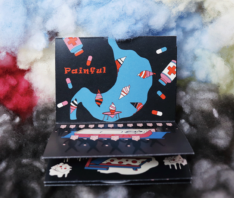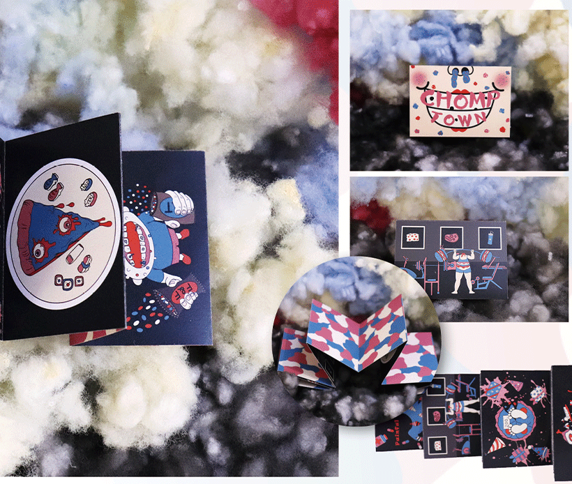 After the confirmation of creativity and style, I completed the painting, and thought about and designed the book binding. In the end, the exquisite "chomp town" small illustrated book was presented. "Chomp" refers to chewing food loudly, like the eating habits of people who are addicted to high-calorie foods. Here you will see the real crisis of high calorie intake.