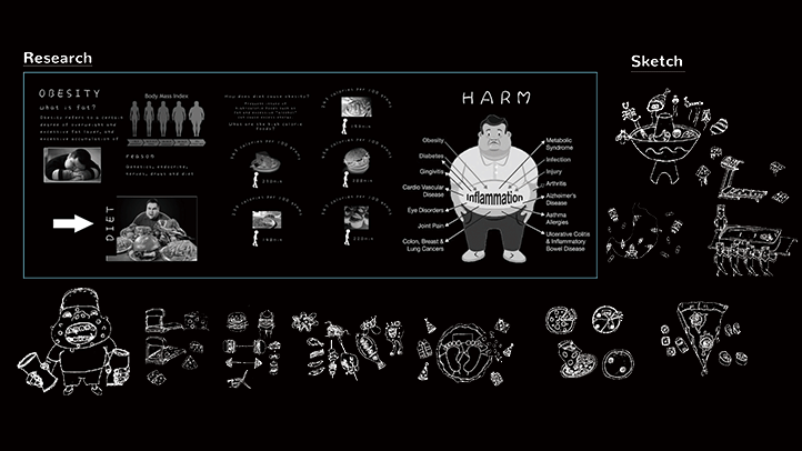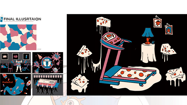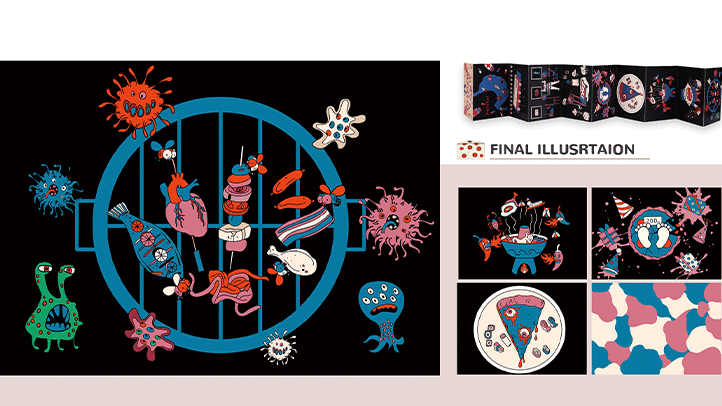Through different styles of experimentations, I brainstormed and finally determined the style of the illustrated book. I used a large number of creative collisions, such as food and germs, food and organ combinations, black, and pink-dark styles to try boldly to suppress appetite, and to produce the stimulation between food and exercise.
