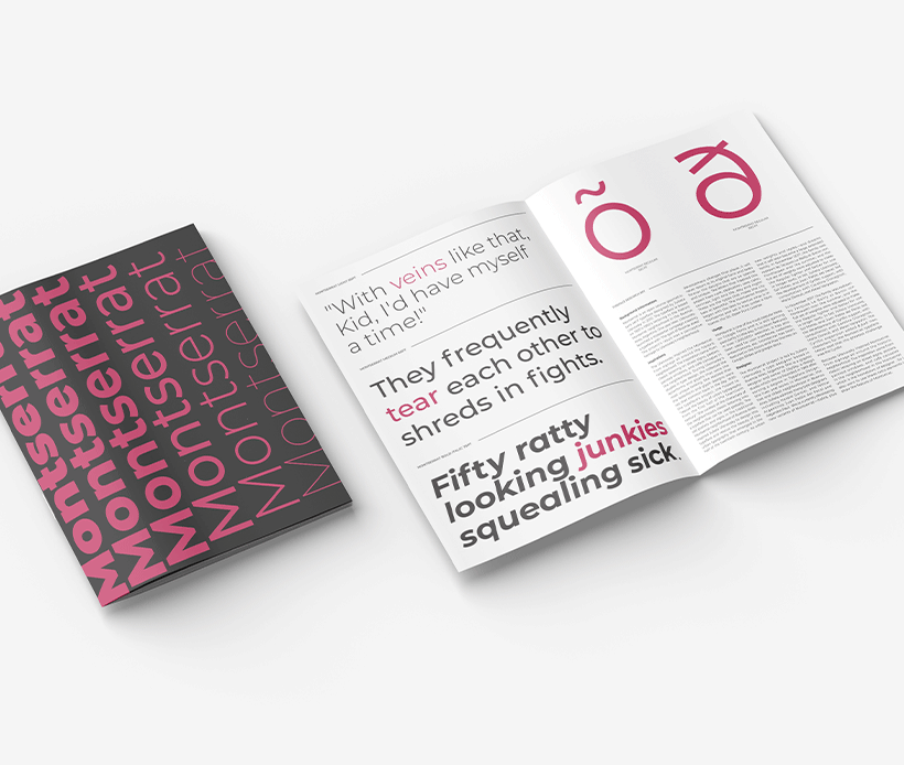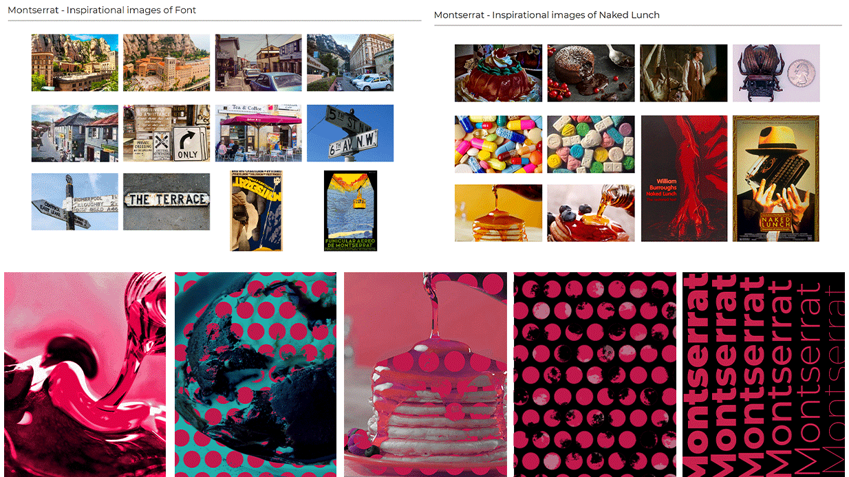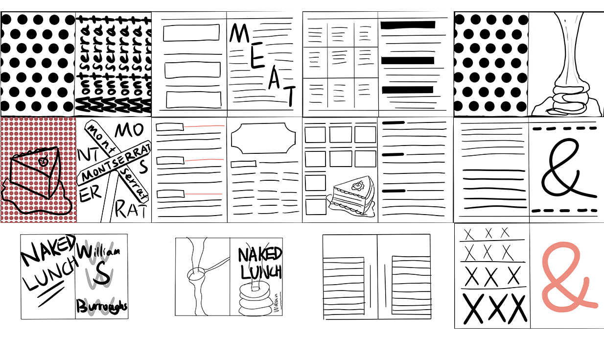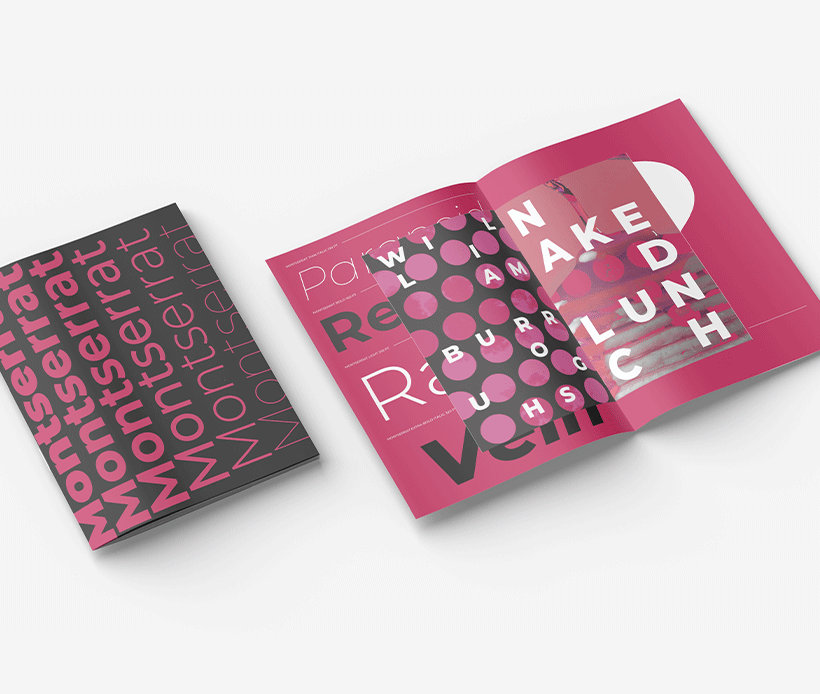 This is a small booklet used to display a font, the booklet includes cover, regular page and small inserts. For the font of booklet, I choose Montserrat. The booklet needs to display Montserrat fonts with different sizes, weights and styles. The text content of the booklet is the novel "Naked Lunch". I need to select key words, sentences and paragraphs from the novel as the text content of the booklet. The illustrations and color parts were made in Photoshop based on the content of the novel.
