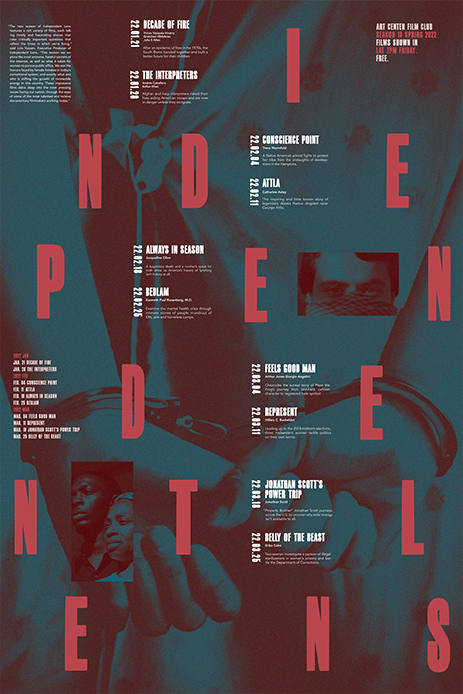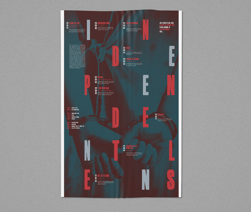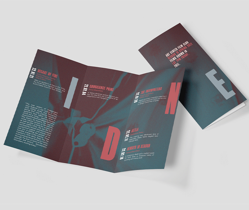This is a poster for ArtCenter Film Club. This poster shows ten films that will be broadcast on Film Club, each of which showcases different social phenomena and issues, including the poster's name, broadcast date and introduction. The poster doesn't just have to look like a complete poster, after being cut and folded, it can also be made into a French-style brochure for people to read.
